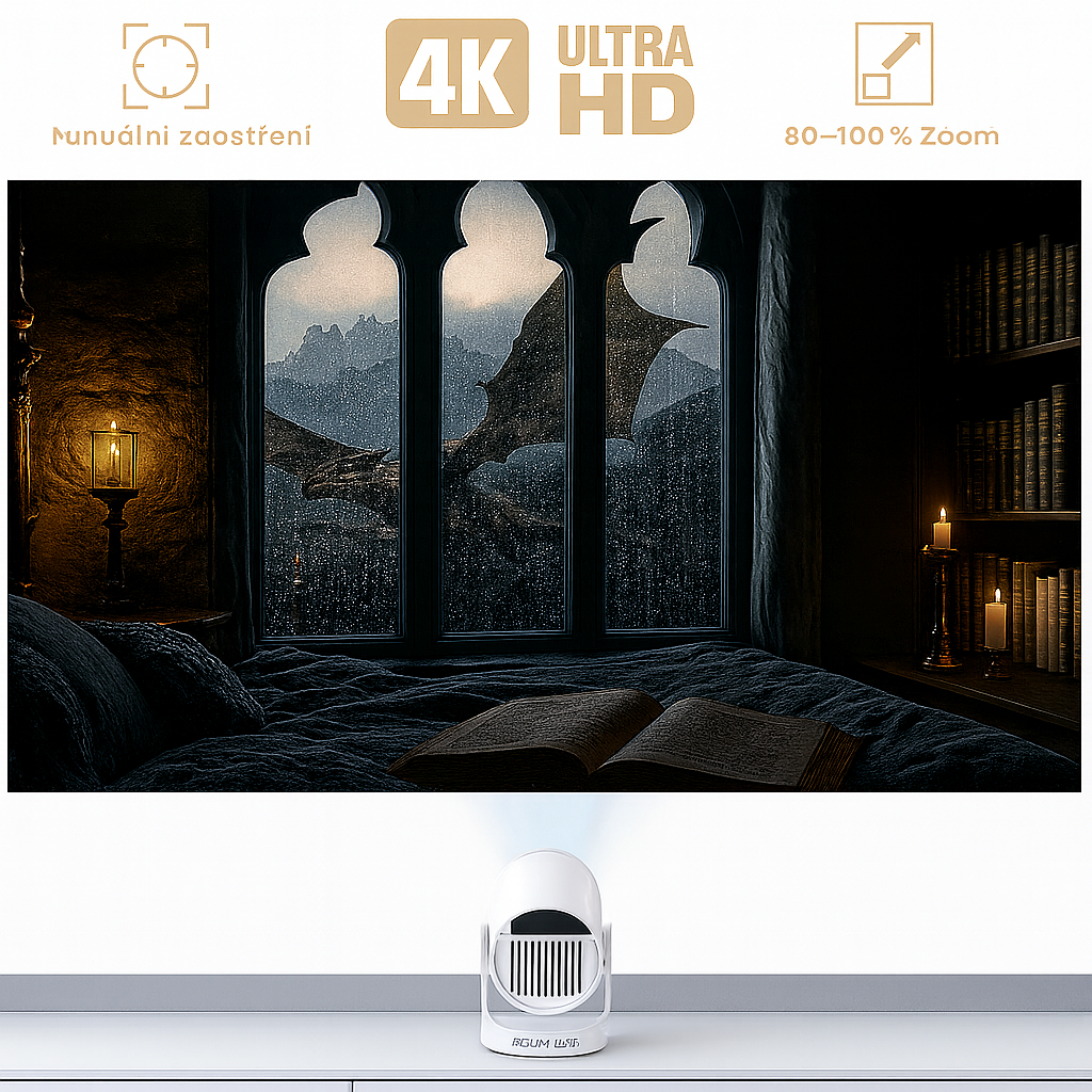 Zažijte úchvatnou vizuální věrnost s projektorem KnihoProjektorl™. Díky podpoře 4K a nativnímu rozlišení 720p, automatickému ostření a vestavěným reproduktorům je každá scéna podána v pohlcujících detailech!